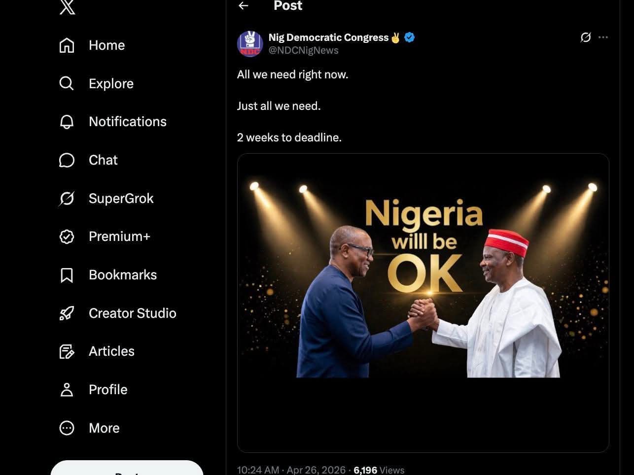 In an X post yesterday obtained by Politics Nigeria, the party wooed Peter Obi and Rabiu Kwankwaso to seize the opportunity of a two-week window to join its platform and secure the presidential ticket.