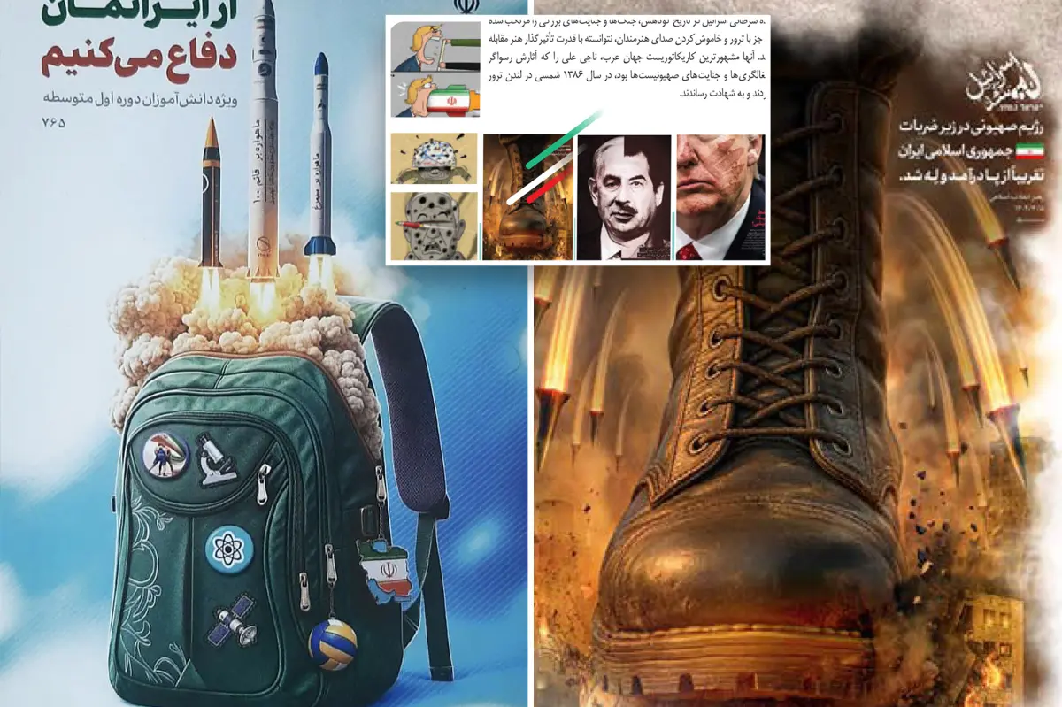 The twisted tomes, entitled “We Defend Our Iran,” were released some time last year after the regime’s humiliation in the 12-Day War and also include images of intercontinental ballistic missiles launching out of a student’s backpack and other graphic war imagery.