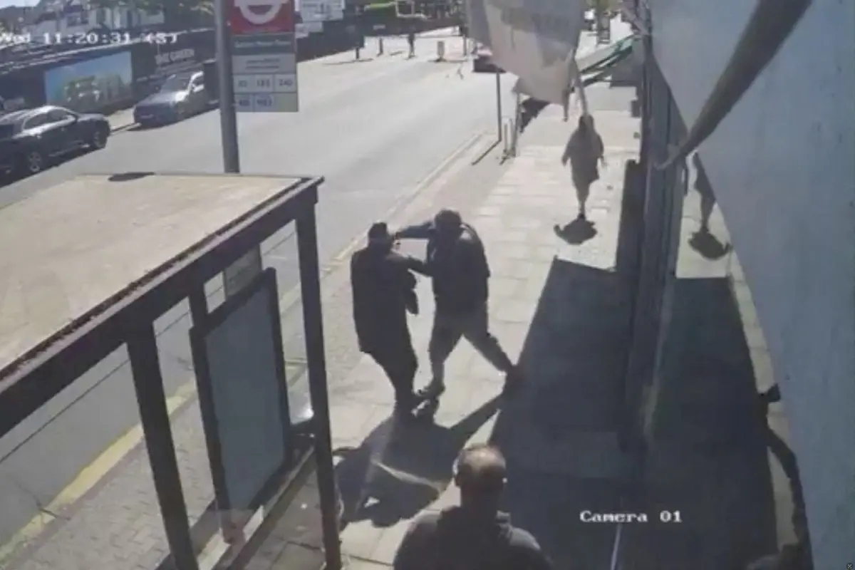 The terrorist pushes the victim against the bus shelter while stabbing him repeatedly during Wednesday’s terrifying attack in Golders Green, a heavily Jewish neighborhood in north London that an Iranian-backed group took credit for.